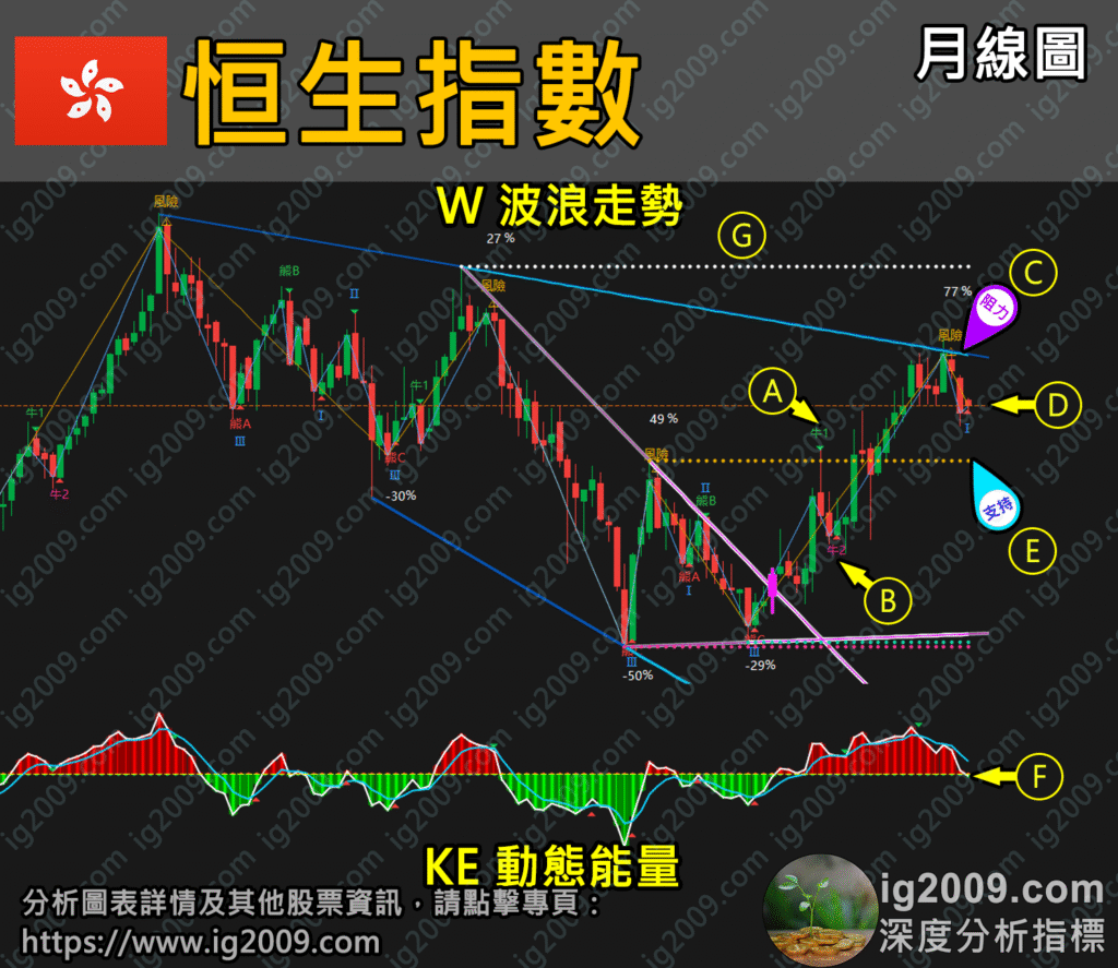 - (E) 「AI 通道線」的橙色虛線「前頂阻力」,屬於最接近的「支持」位置,當回吐調整到達這裏,適宜加倍留意;如「月線」收市,未有跌穿,有機會屬於「牛4」尾聲,同時也是「牛5」的開端。(可設為防守位)。